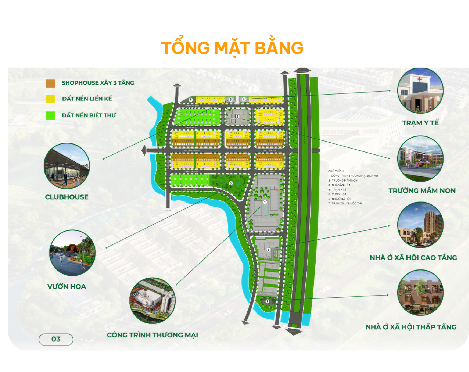 Với tổng diện tích 10,8ha. 100 căn Shophouse, 150 lô đất nền. Diện tích shophouse: 99 – 162,3m² Quy chuẩn 3 tầng + 1 lửng + 1 tum. Đất nền: 80 – 167,5m² (nhà lô) – 187 – 242m² (biệt thự) |