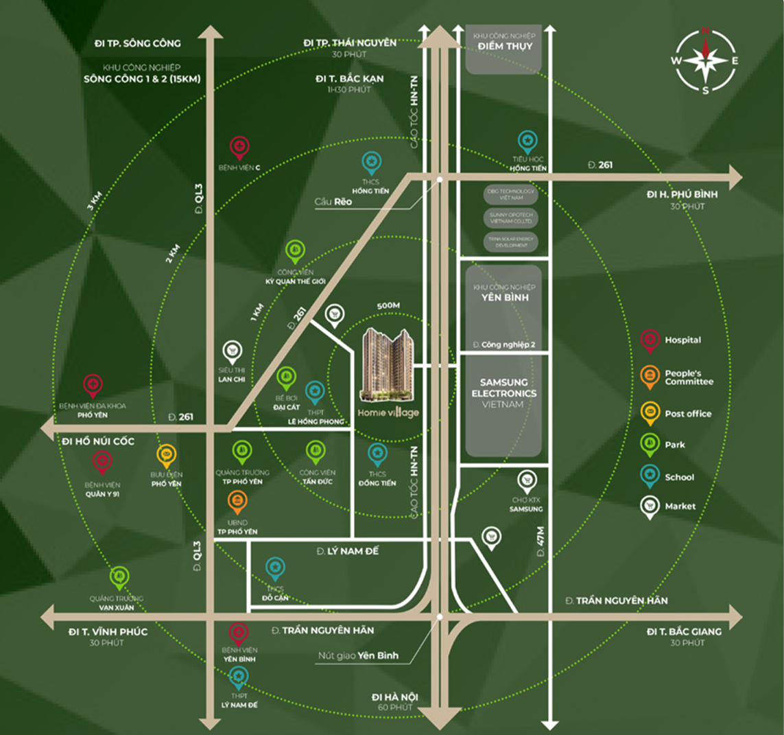 Dự án nằm ở vị trí chiến lược, đối diện SamSung Electronics Vietnam, một trong những khu công nghiệp lớn nhất khu vực, cách các tiện ích hành chính, giáo dục, y tế và giải trí chỉ từ 3–10 phút. Vị trí này không chỉ thuận tiện cho cư dân mà còn thu hút lao động nước ngoài và đáp ứng nhu cầu nhà ở cho công nhân tại các khu công nghiệp lân cận.